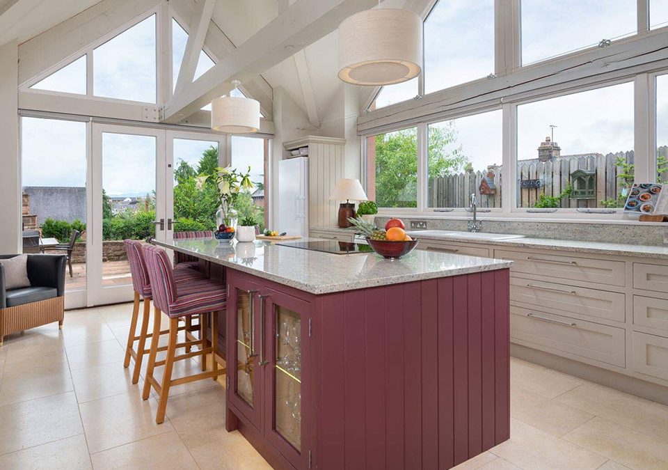 Huge Douglas fir trusses with inset glazed panels and double French doors to make the most of the panoramic views over the Lakeland fells.
