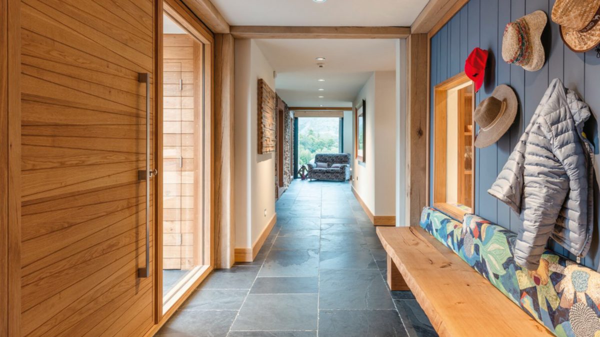 A huge piece of European oak was selected for the seating area for footwear removal, a living edge was left on the timber giving it natural look. The large kiln dried plank was taken to site, which allowed the customer to select exactly which features they liked, making it totally personal. The oak was planed but not totally flat as a natural uneven surface was chosen, all sealed with a matt Osmo oil. This was sat on a slate floor.